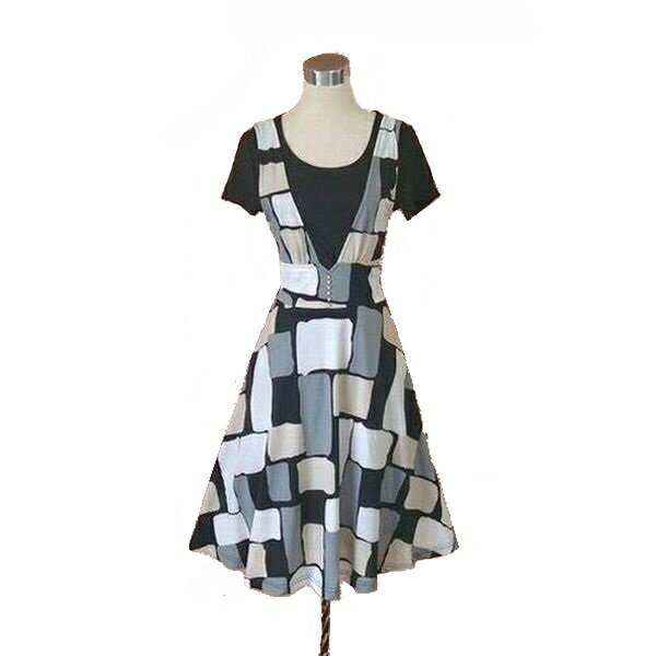 【ラスト1点】 ワンピース 半袖 夏 レディース チェック柄 膝丈 ジャンパースカート風 アンサンプルデザイン 上質 ミディアム フレア ジャージワンピース グレー ベージュ ホワイト 白 ミックス マルチカラー